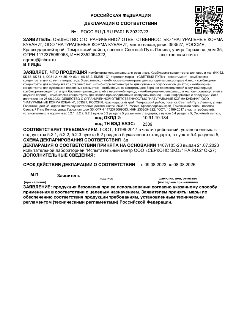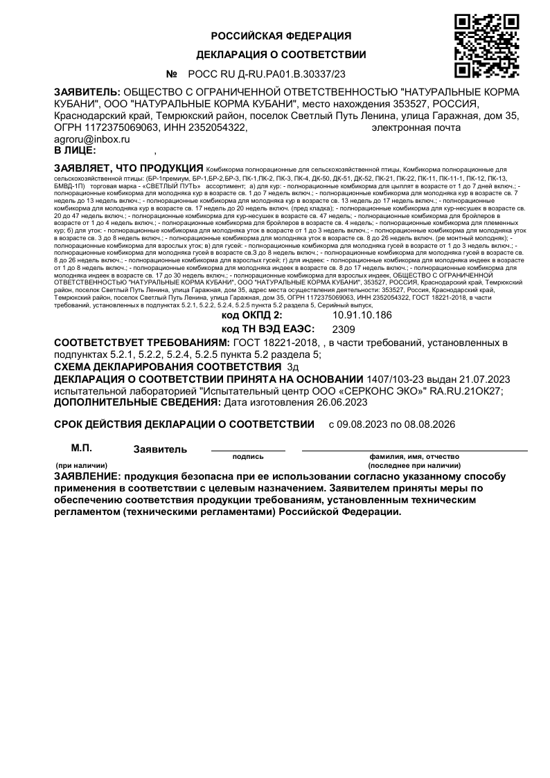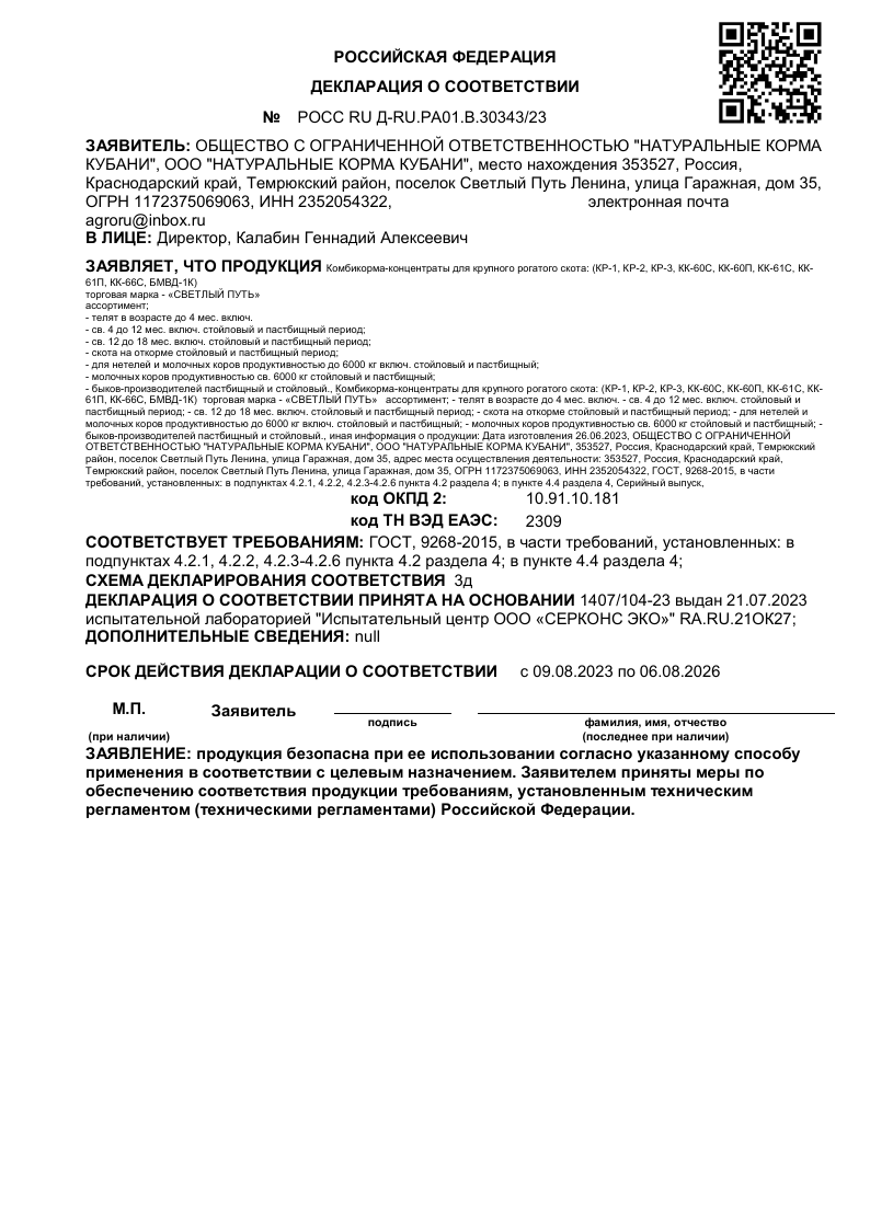 生产动物饲料的注册商标为 "LIGHT WAY ®"。我们饲料的独特优势在于挤压、制粒和混合生产的技术可能性(预挤压成分被粉碎并部分导入制粒机,作为制粒混合物的一部分)。 真空下脂肪导入技术的应用使颗粒饲料中的脂肪饱和度高达 40%。生产的饲料系列符合俄罗斯联邦国家标准(GOST)的要求,并通过合格声明予以确认: